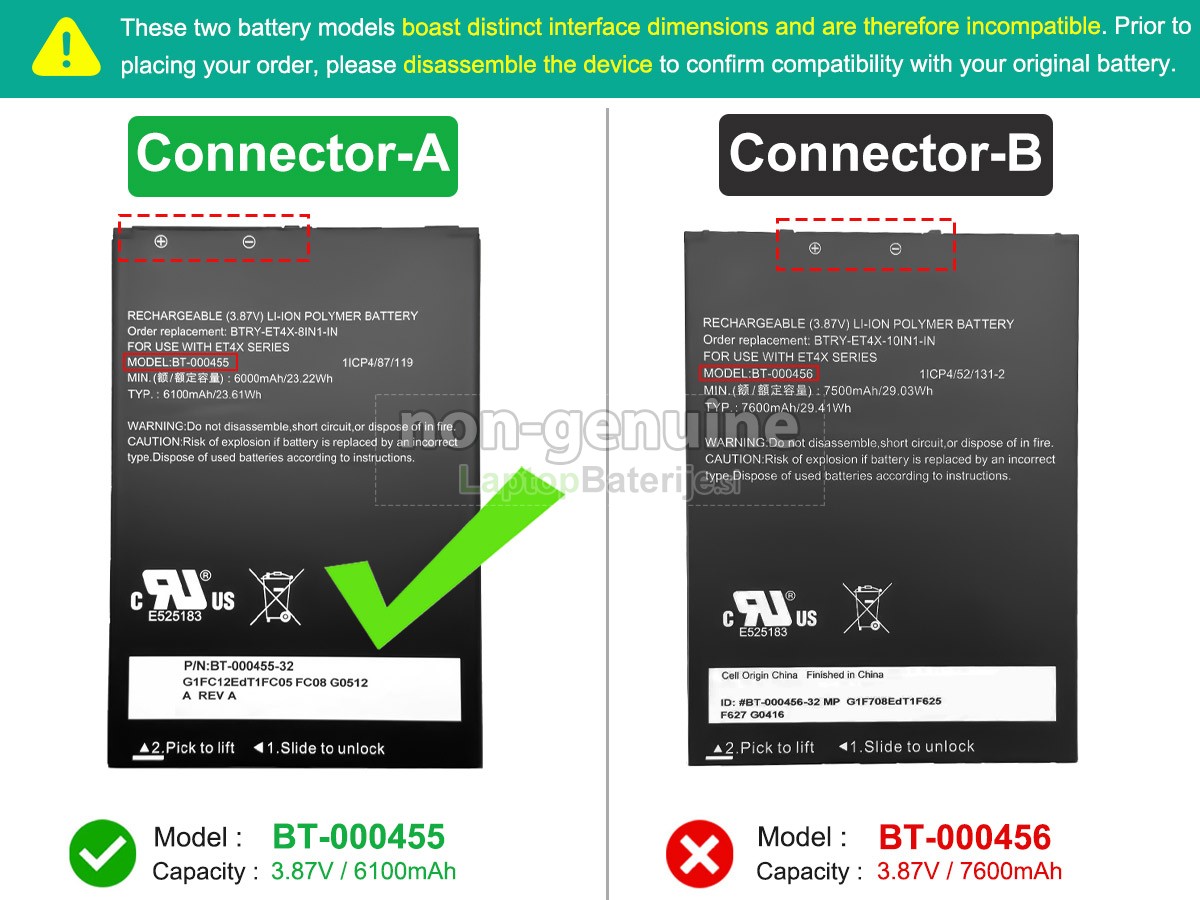 Laptopbaterije.si zagotavlja varnost vsake baterija Zebra ET45HC že pri viru. Popolnoma se zavedamo pomembnosti vprašanj varnosti baterij, zato slovesno obljubljamo: nikoli ne bomo uporabili slabih surovin! Vsaka Zebra ET45HC baterija je, preden zapusti tovarno, podvržena več sto strogim testom, ki zagotavljajo standarde visoke kakovosti. Pri nadzoru kakovosti baterij smo izjemno strogi. Nadomestne baterija Zebra ET45HC, ki pridejo v vaše roke, morajo prestati CE, UL, GS in druge mednarodne varnostne certifikate. Poleg tega bo naša tehnična ekipa pred pošiljanjem preverila napetost in zmogljivost baterije, da bi zagotovila pravilno delovanje.